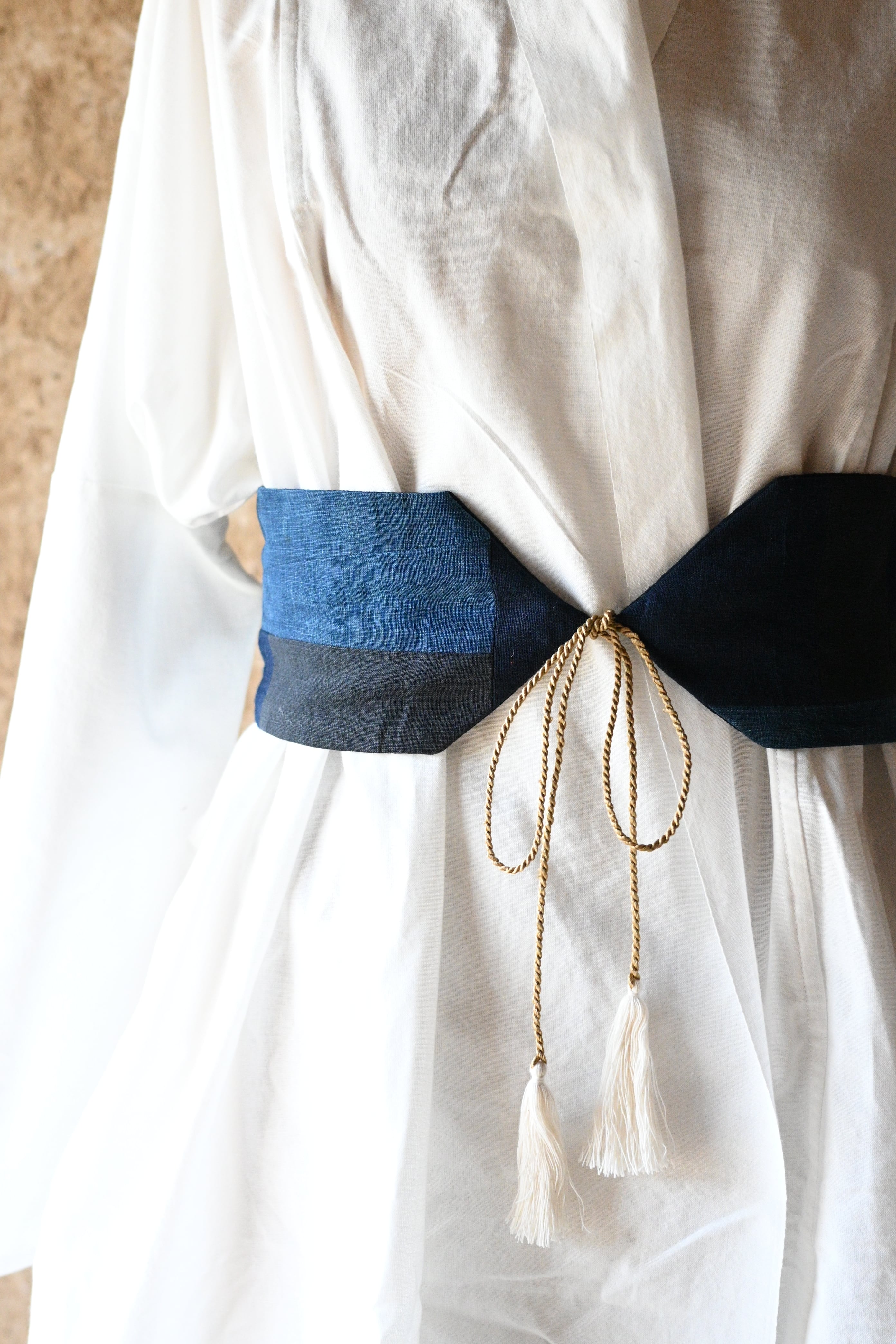 廻 おなじものは1つとしてない 小さなハギレたちを繋ぎあわせた帯. 何十年も前に誰かの手によって紡がれた 絹糸の綛(かせ)を解き 丁寧に糸をよって紐にしました. くすみの中から 浮かびあがるように輝く金色は まるで真鍮を思わせるかのような 味わい深さがあります. ほんの小さなハギレと 細い細い糸たちを 人の手で美しく仕立てる. あゝ暮らすための ものづくりは素晴らしい. ✳︎ 着用写真はイメージですので 実物のデザインと異なることがあります. ーーーーーーーーーー 寸法 帯 70cm × 10cm 腰紐 片側 40cm 素材 綿